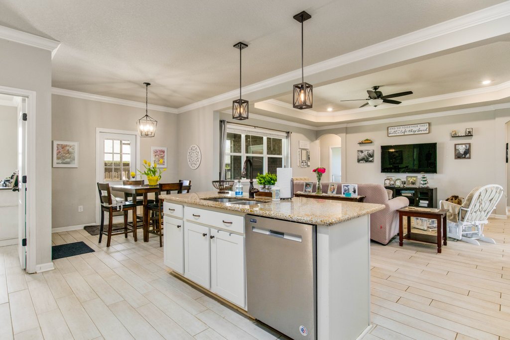 Inside, you’ll find tile flooring throughout and a well-appointed kitchen with granite countertops, stainless steel appliances, custom cabinetry, and a spacious island—perfect for cooking and entertaining. The first-floor master suite includes a walk-in closet, a relaxing soaker tub, and a separate shower.